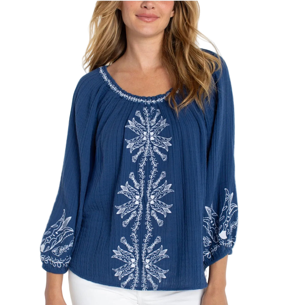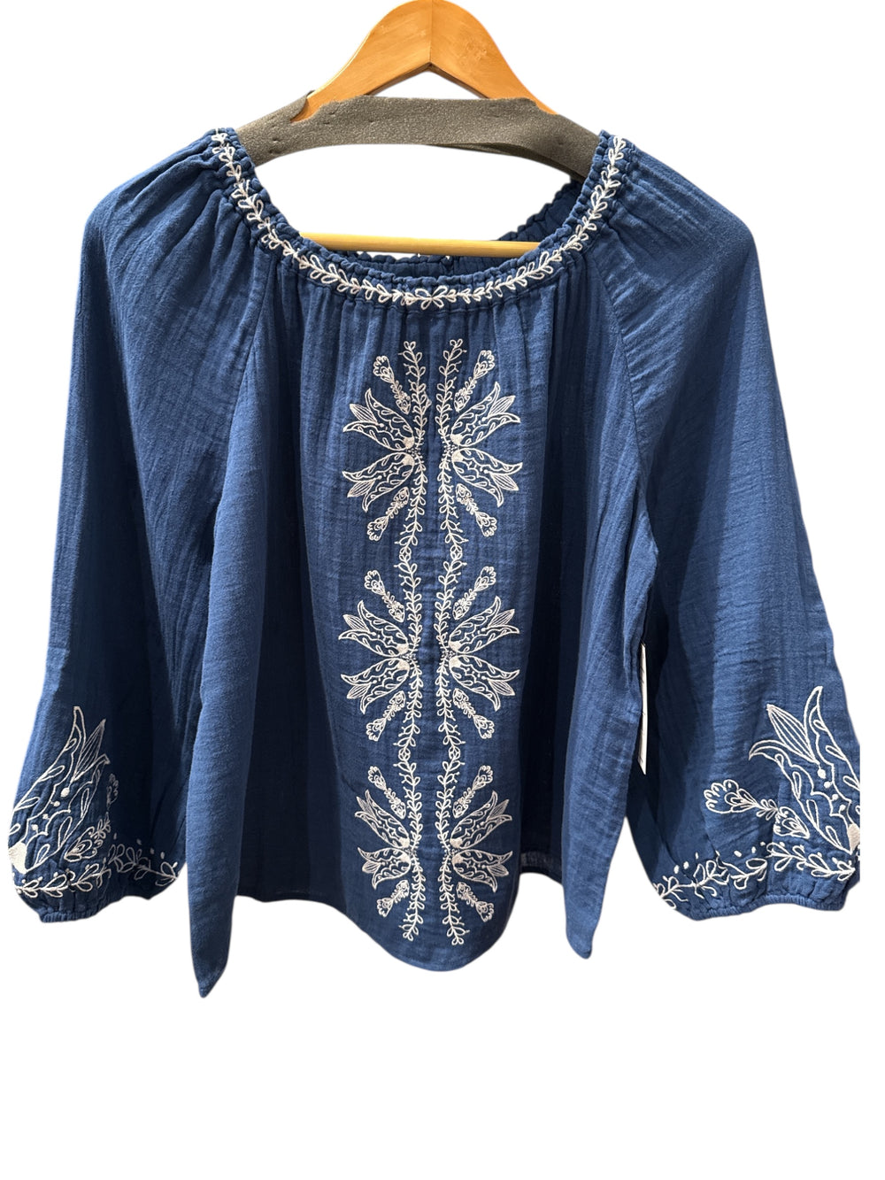 Embroidered Gauze peasant blouse. Navy blue with white embroidery.