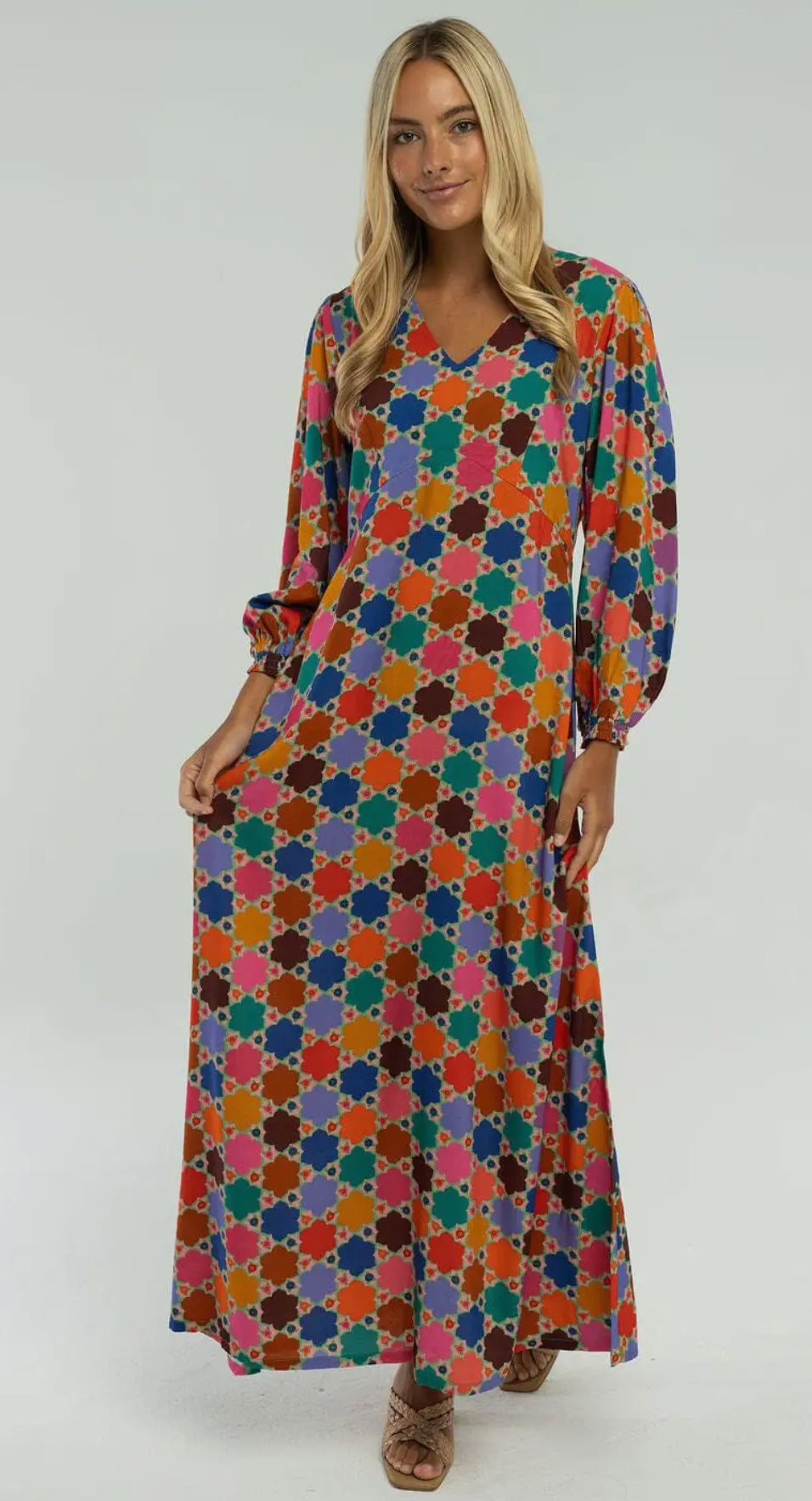 The Layla Maxi Dress is your new go-to for looking effortlessly put-together from sunrise to sunset. This vibrant stunner features a bold geometric V-neck that commands attention and gathered cuffs that add a playful touch of sophistication. Whether you're heading to brunch with friends or transitioning to an evening out, this versatile maxi glides seamlessly through your day. The eye-catching design pairs perfectly with sneakers for casual vibes or heels when you want to elevate your look. Comfort meets style in this must-have piece that proves you don't have to choose between feeling fabulous and feeling free.