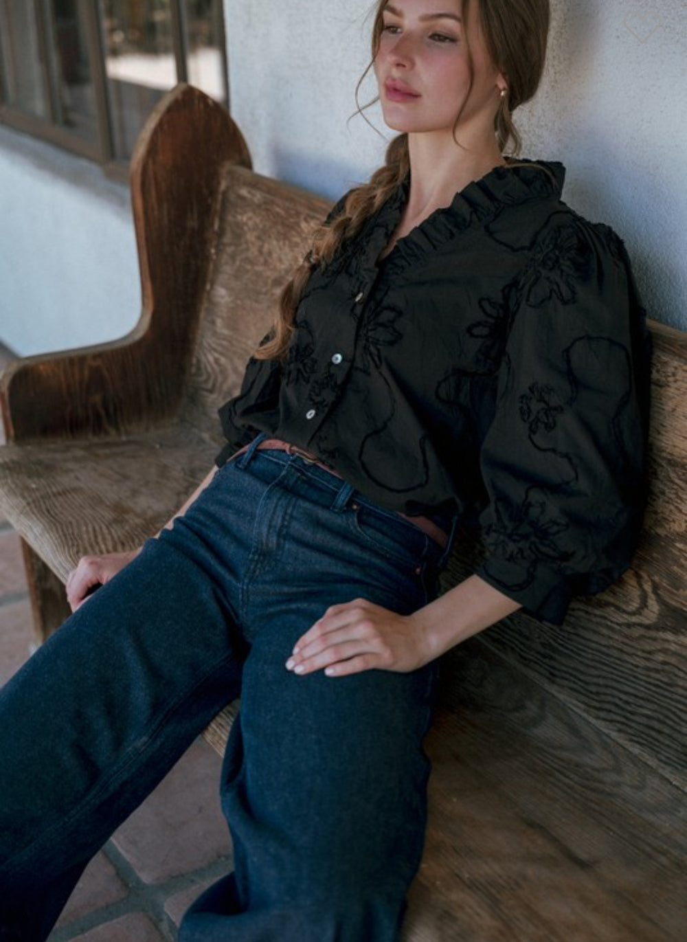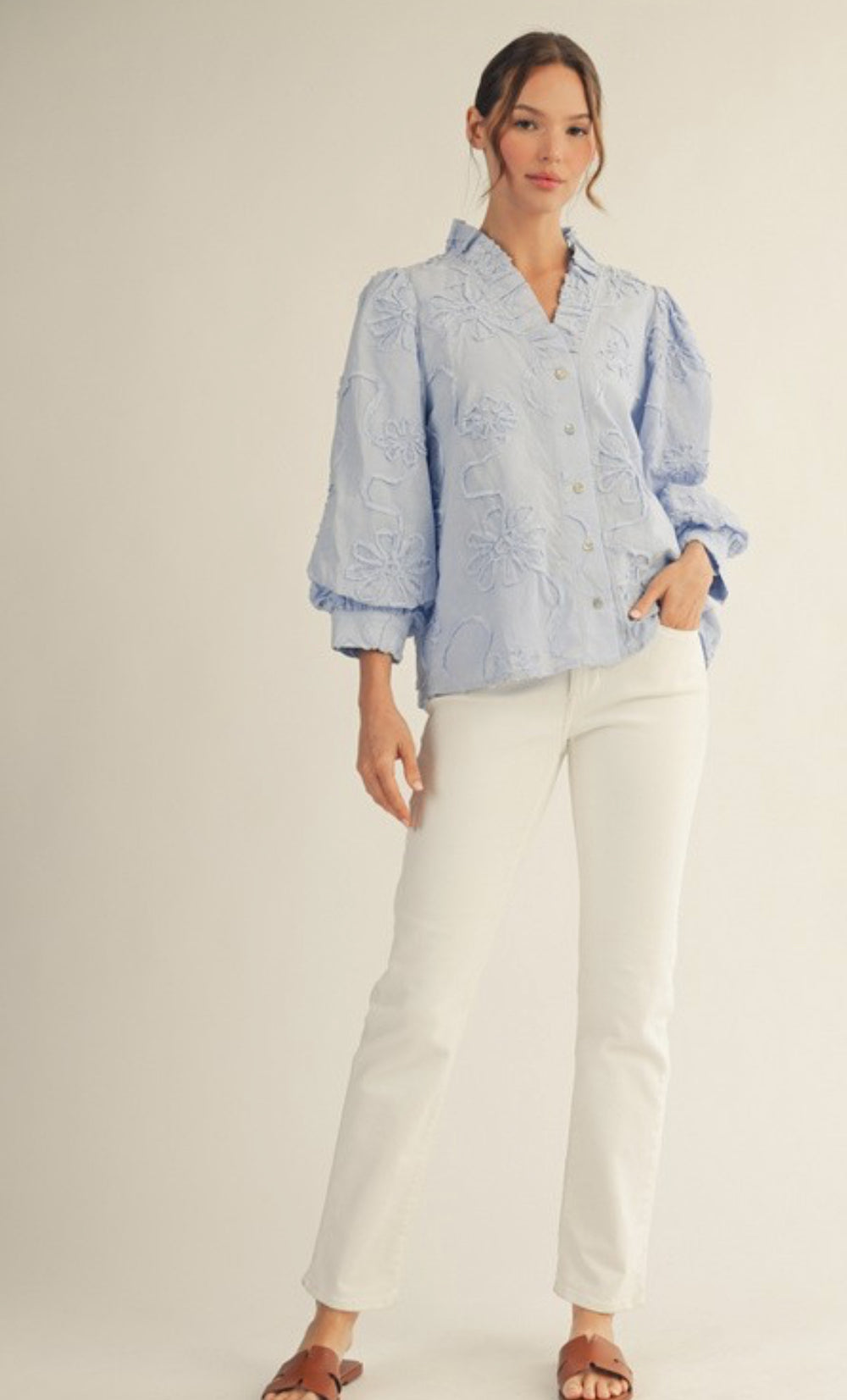 Elevate your everyday style with this charming 3D Design Blouse, where texture meets whimsy. The delicate flower appliqués adorning the front create instant visual interest, while the ruffled neckline adds a flirty, feminine touch. Three-quarter sleeves offer the perfect balance of coverage and breathability, and the textured fabric brings dimension to your wardrobe. Button-front closure makes dressing effortless. Perfect for brunch dates, casual outings, or whenever you want to add a playful pop of personality to your look.