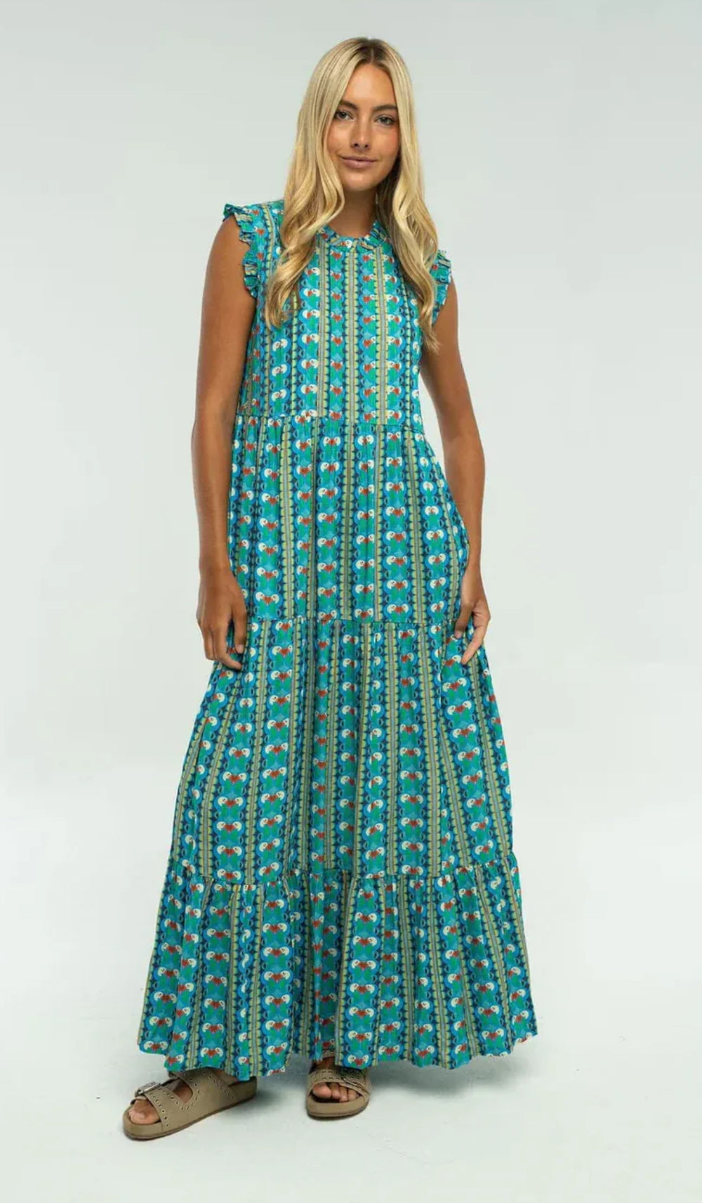 Bright, breezy, and beautifully bold — the Clara Maxi in Toucan brings playful elegance to warm-weather dressing. Designed in a vibrant teal-based print filled with colorful toucans and charming geometric accents, this dress is the ultimate statement piece for sunny days and relaxed evenings.