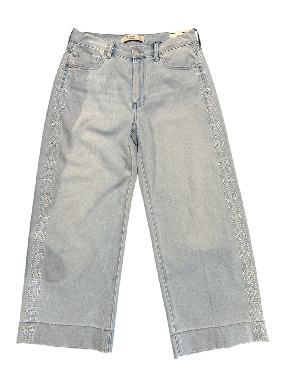 Liverpool Stride, wide leg jeans in marine blue with flower embroidery on side seam. Soft, comfortable denim with just the perfect amount of stretch.