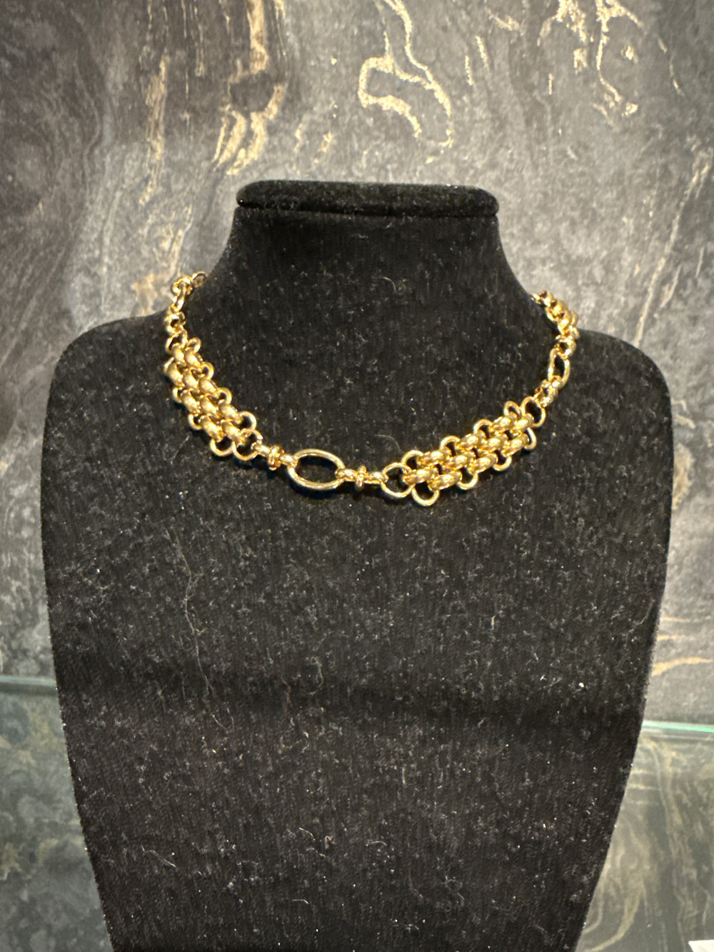 Beautiful, chunky chain choker! Great for layering with longer pieces! Steel chains Goldplated copper parts with 24k gold Adjustable with steel closure and extra chain From top to bottom: Chunky chain choker 33cm