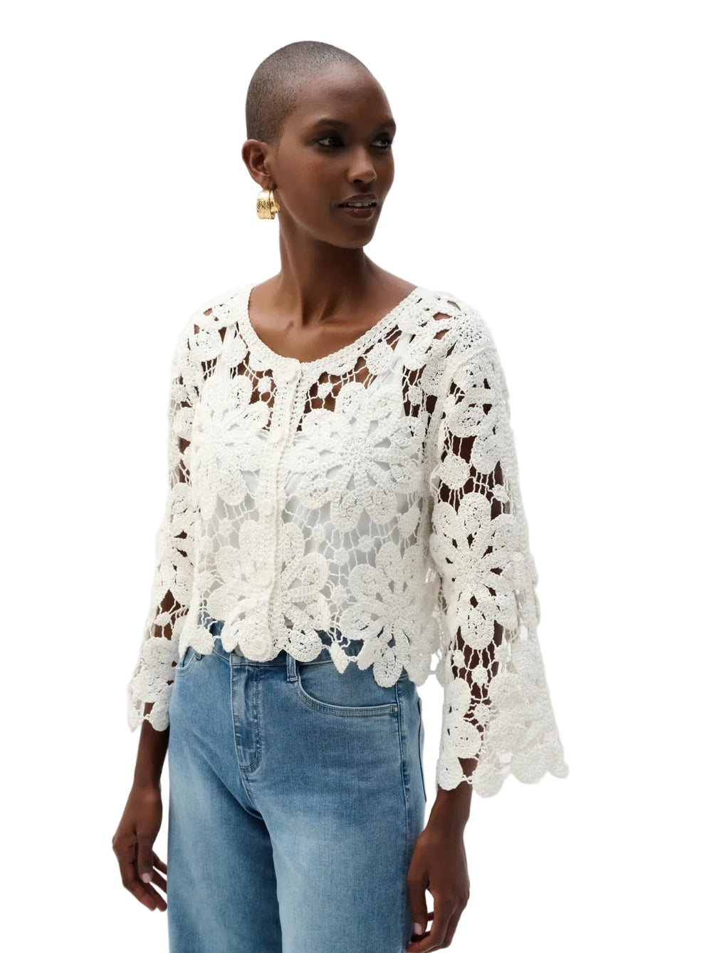 Crafted from soft knit cotton, this boxy cardigan delivers effortless sophistication with its relaxed silhouette and intricate crochet detailing. The three-quarter sleeves offer a modern proportion, while tone-on-tone buttons provide understated elegance. A versatile layering essential that transitions seamlessly from casual to polished occasions, this piece anchors any wardrobe with timeless appeal and refined construction.
