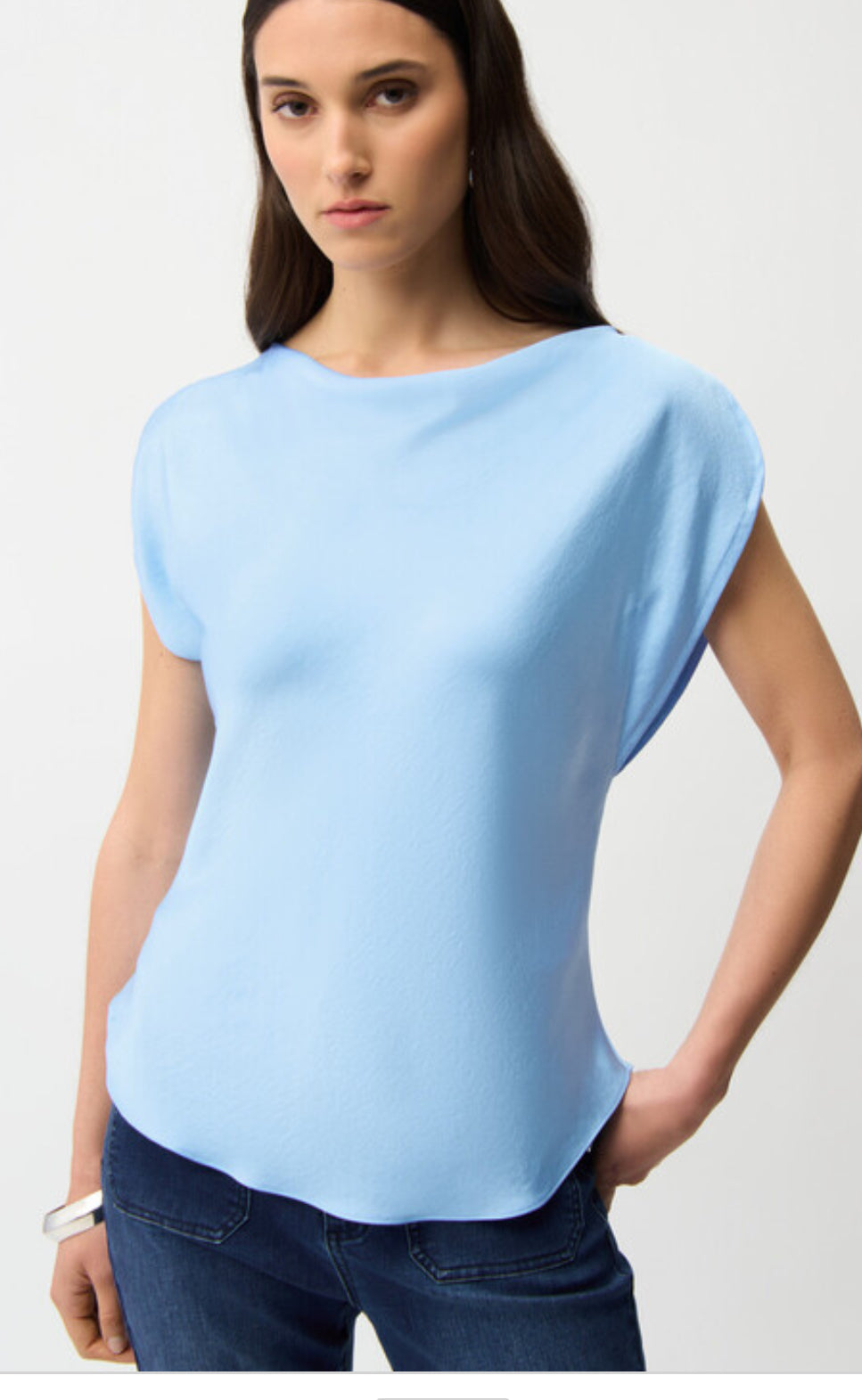 Introducing the Joseph Ribkoff pullover that effortlessly combines chic style with casual comfort. This hip-length, relaxed fit piece features a sophisticated boat neck and draped design, perfect for summer occasions. The plain, sleeveless look with cap sleeves offers a timeless appeal, making it a versatile addition to your wardrobe. Ideal for those who appreciate understated elegance and easygoing fashion.