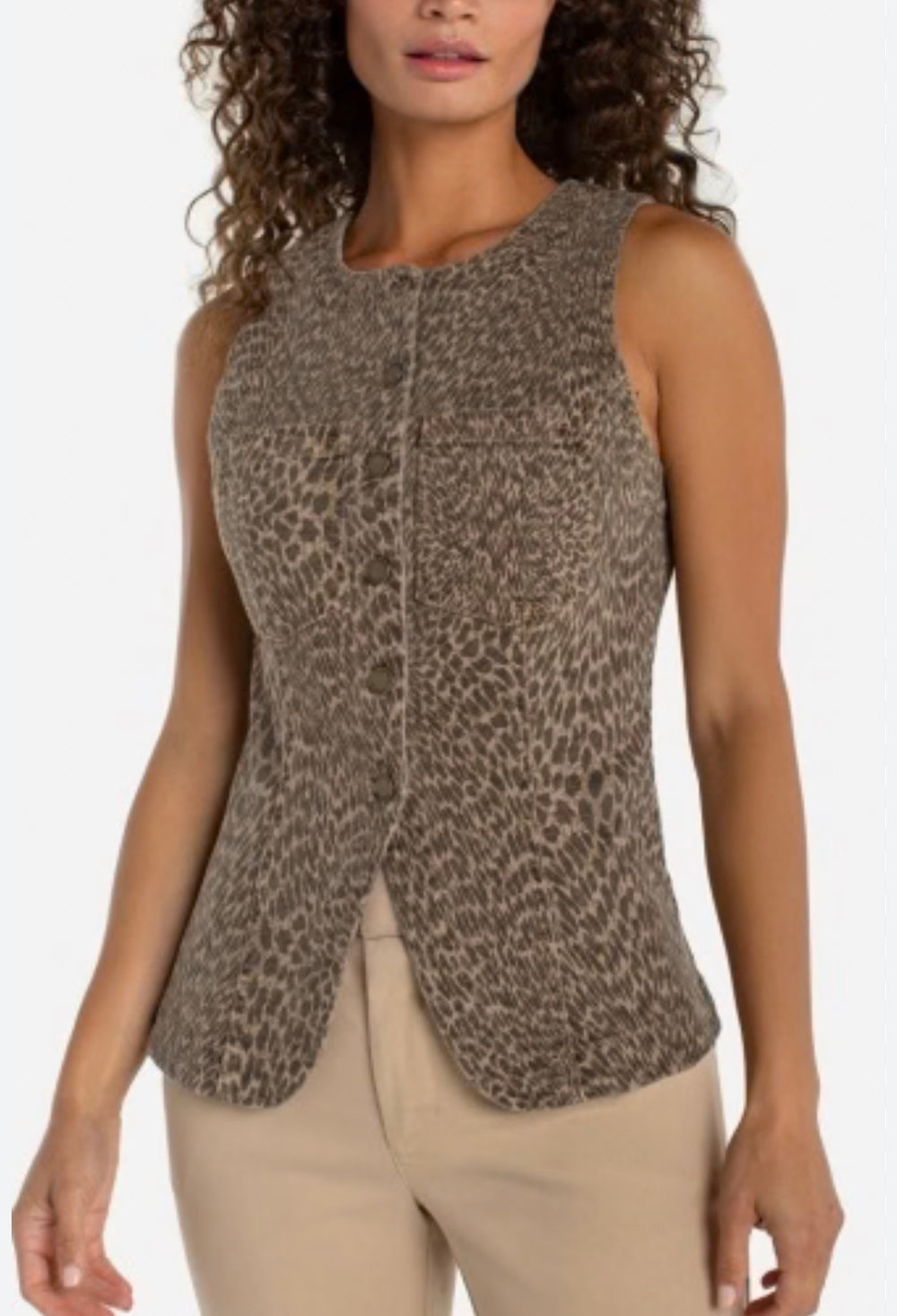 Crew neck split front vest in khaki with abstract animal print. A versatile layering piece that adds instant style to any outfit.