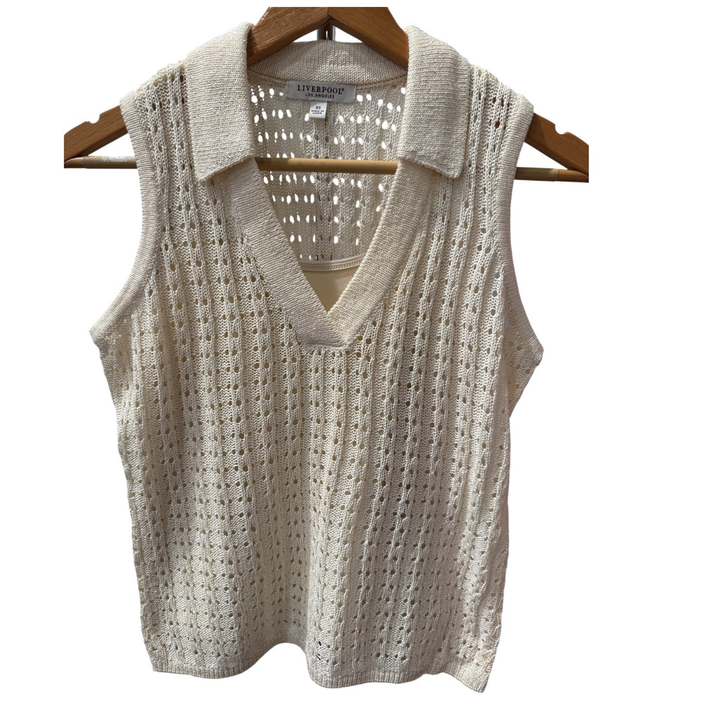 Crochet sleeveless v neck polo style top. It includes an attached cami. Color: cream