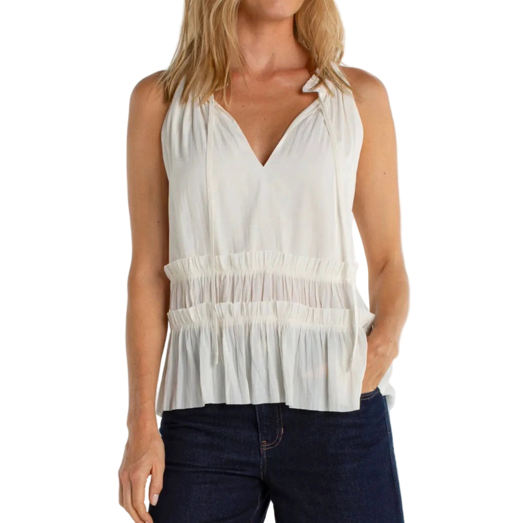 Polished enough for daytime plans, soft enough for after hours. This sleeveless woven top features romantic ruffle details and a flattering V-neckline with an adjustable tie. An easy piece that transitions seamlessly from work to wherever the night takes you.