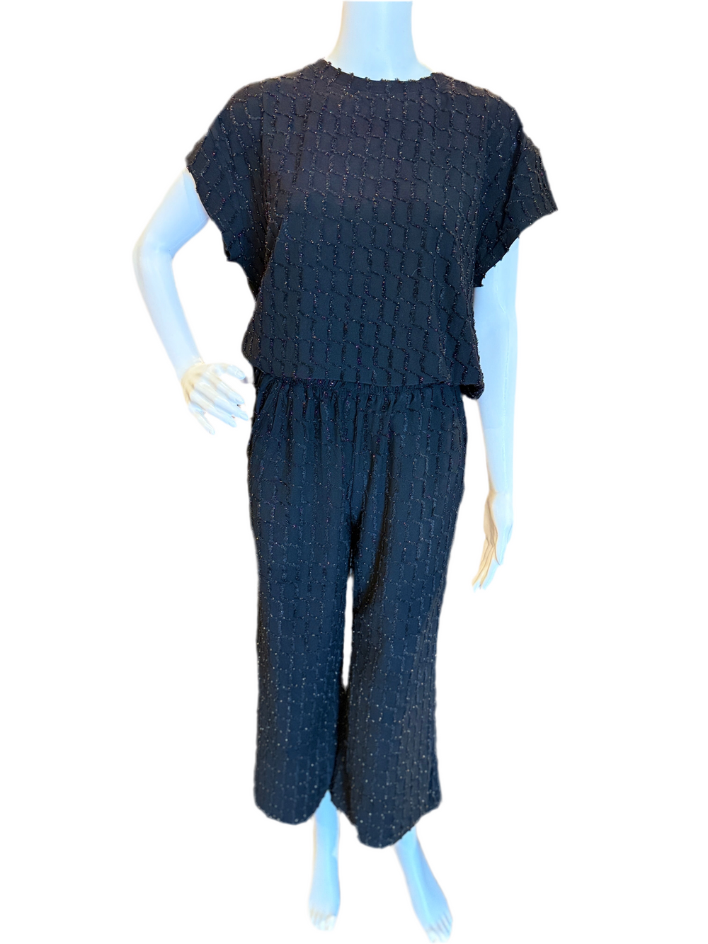 Introducing our Short Sleeve Glitter Set - the perfect travel companion. This set features a stylish black 3D fabric with gold threads, paired with a crop pant that has an elastic waist and pockets for convenience. With a front button design and short sleeves, this set is not only fashionable but also practical for any trip.
